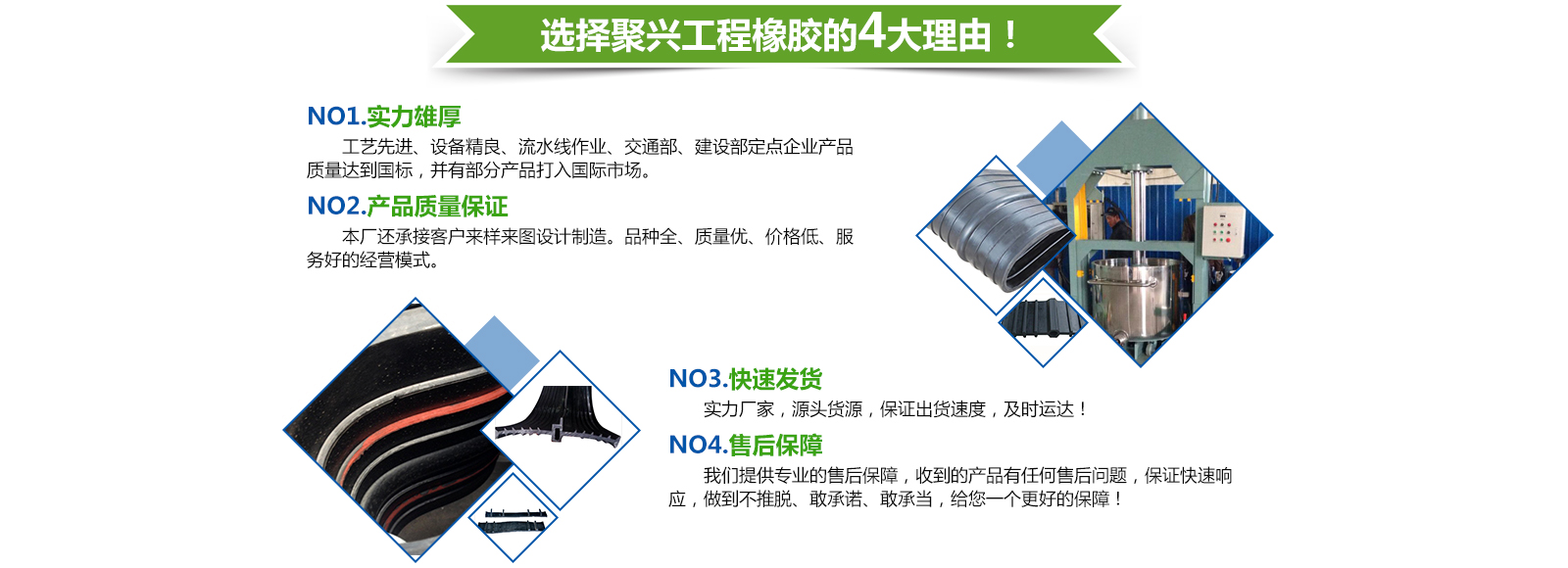 衡水聚興工程橡膠有限公司,位于河北省衡水市榕花街,石德高速,石德鐵路,京九鐵路在此交匯,106國道,石黃高速由境內(nèi)穿過。得天獨(dú)厚的地理位置為公司的發(fā)展創(chuàng)造了良好的交通條件。本廠工藝先進(jìn)、設(shè)備精良、流水線作業(yè)、交通部、建設(shè)部定點(diǎn)企業(yè)產(chǎn)品質(zhì)量達(dá)到國標(biāo),并有部分產(chǎn)品打入國際市場、我廠主要生產(chǎn)止水帶、橋梁支座、輸送帶、伸縮縫、托滾高壓膠管,并按圖加工各種橡膠制品。同時本廠還承接客戶 ...